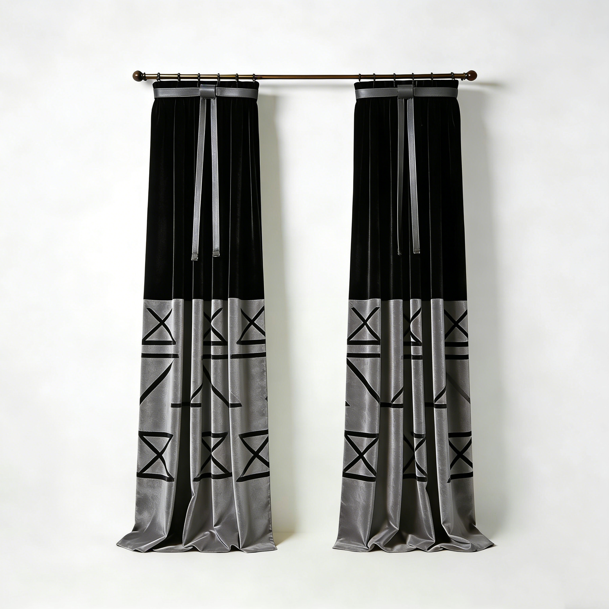 Bold black and grey curtains with modern geometric patterns. Sleek, contemporary style for a minimalist living space.
