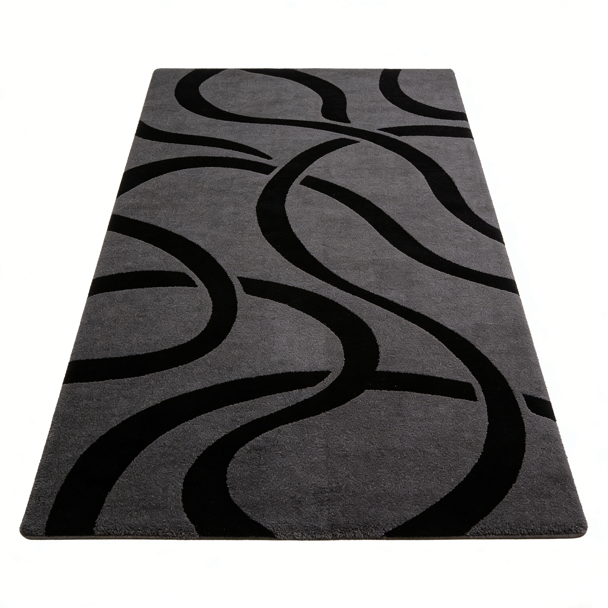Sleek grey runner rug with bold black abstract swirl patterns. Modern minimalist design adds a sophisticated touch to hallways, offices, or living rooms.