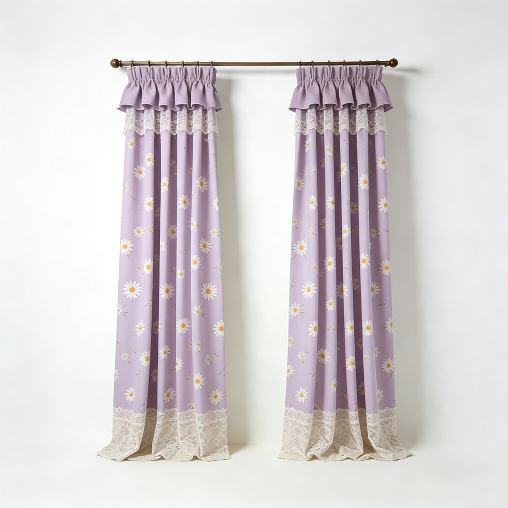 Soft lavender curtains with white daisy print and ruffled lace trim. Cheerful floral style for a bedroom or kitchen.