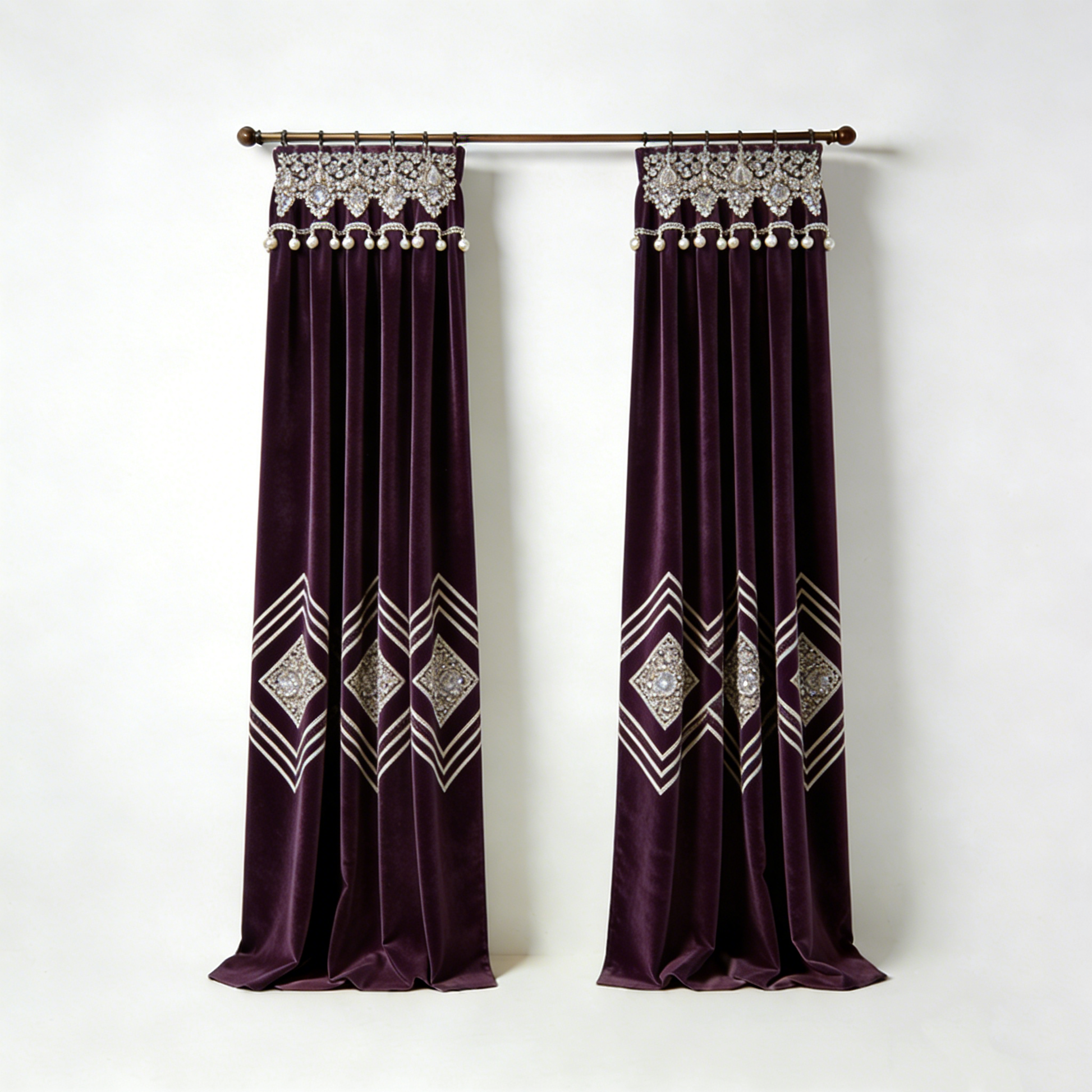 Deep purple velvet curtains with diamond embroidery and crystal details. Glamorous, bold style for a statement room.